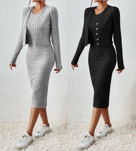 • Kadın uzun kollu şardonlu kaşkorseönü düğmeli mini boy elbise ikili takım