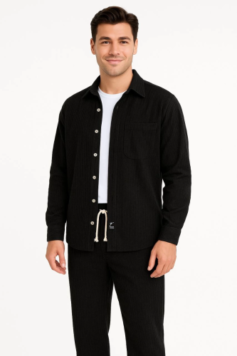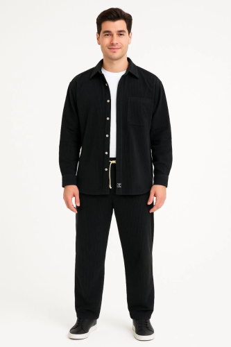Erkek Kadife Oversize Takım Gömlek ve Pantolon İkili Set Füme Corduroy Şıklığı Rahat ve Zarif Duruş Yumuşak Dokulu Kadife Kumaş Düğmeli Gömlek Üst ve Lastikli Pantolon Alt Parça ile Gün Boyu Konfor Siyah