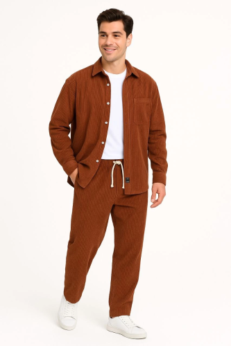 Erkek Kadife Oversize Takım Gömlek ve Pantolon İkili Set Füme Corduroy Şıklığı Rahat ve Zarif Duruş Yumuşak Dokulu Kadife Kumaş Düğmeli Gömlek Üst ve Lastikli Pantolon Alt Parça ile Gün Boyu Konfor Kiremit
