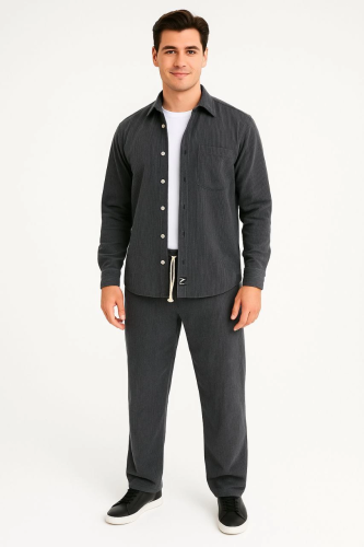 Erkek Kadife Oversize Takım Gömlek ve Pantolon İkili Set Füme Corduroy Şıklığı Rahat ve Zarif Duruş Yumuşak Dokulu Kadife Kumaş Düğmeli Gömlek Üst ve Lastikli Pantolon Alt Parça ile Gün Boyu Konfor Füme
